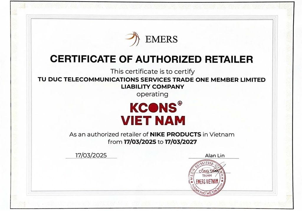 TU DUC TELECOMMUNICATIONS SERVICES TRADE ONE MEMBER LIMITED LIABILITY COMPANY, operating under the brand KCONS VIET NAM, is officially recognized as an Authorized Retailer of Nike Products in Vietnam.
